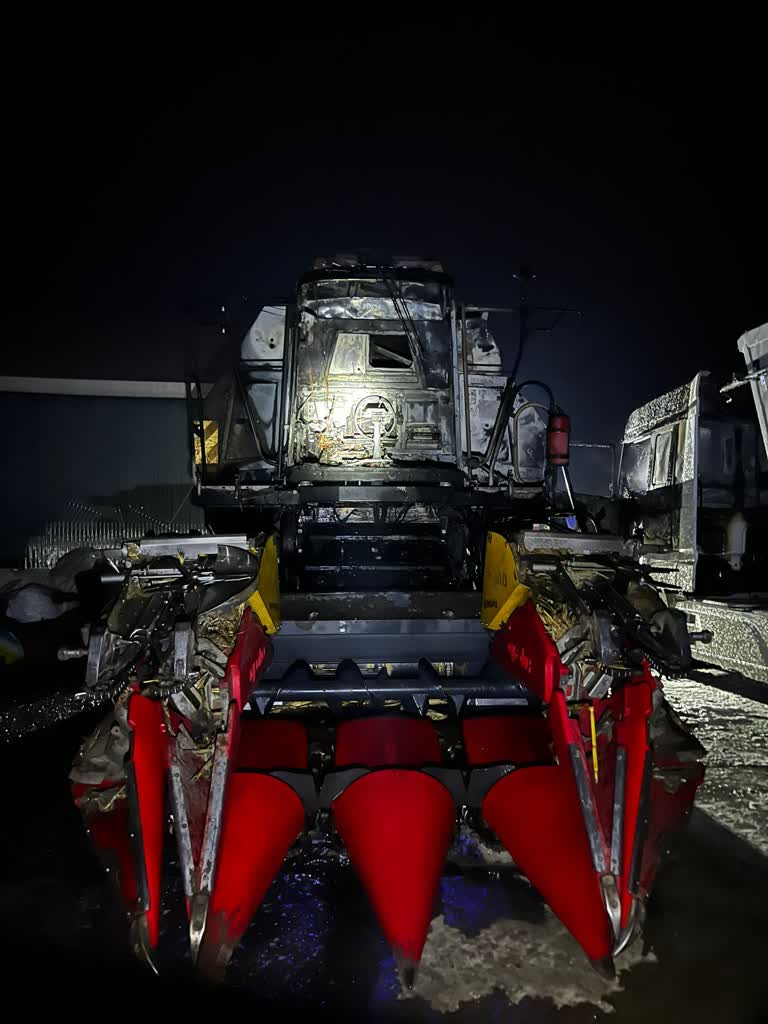 Przed przybyciem straży właścicielowi udało się odjechać jednym samochodem ciężarowym i dwiema naczepami. Akcja gaśnicza trwała niemal 3 godziny. Brało w niej udział 33 strażaków. Spaleniu uległy trzy samochody ciężarowe, pięć naczep ciężarowych i kombajn rolniczy.