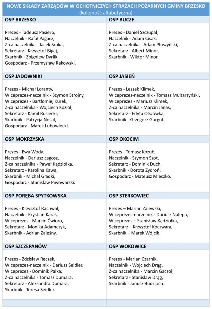 Najwięcej zmian zaszło w OSP w Okocimiu (Prezesa Janusza Piekarczyka zastąpił Tomasz Kozub), Brzesku (od teraz jednostkę prowadzi Tadeusz Pasierb) i Mokrzyskach (dowództwo objęła Ewa Woda).
