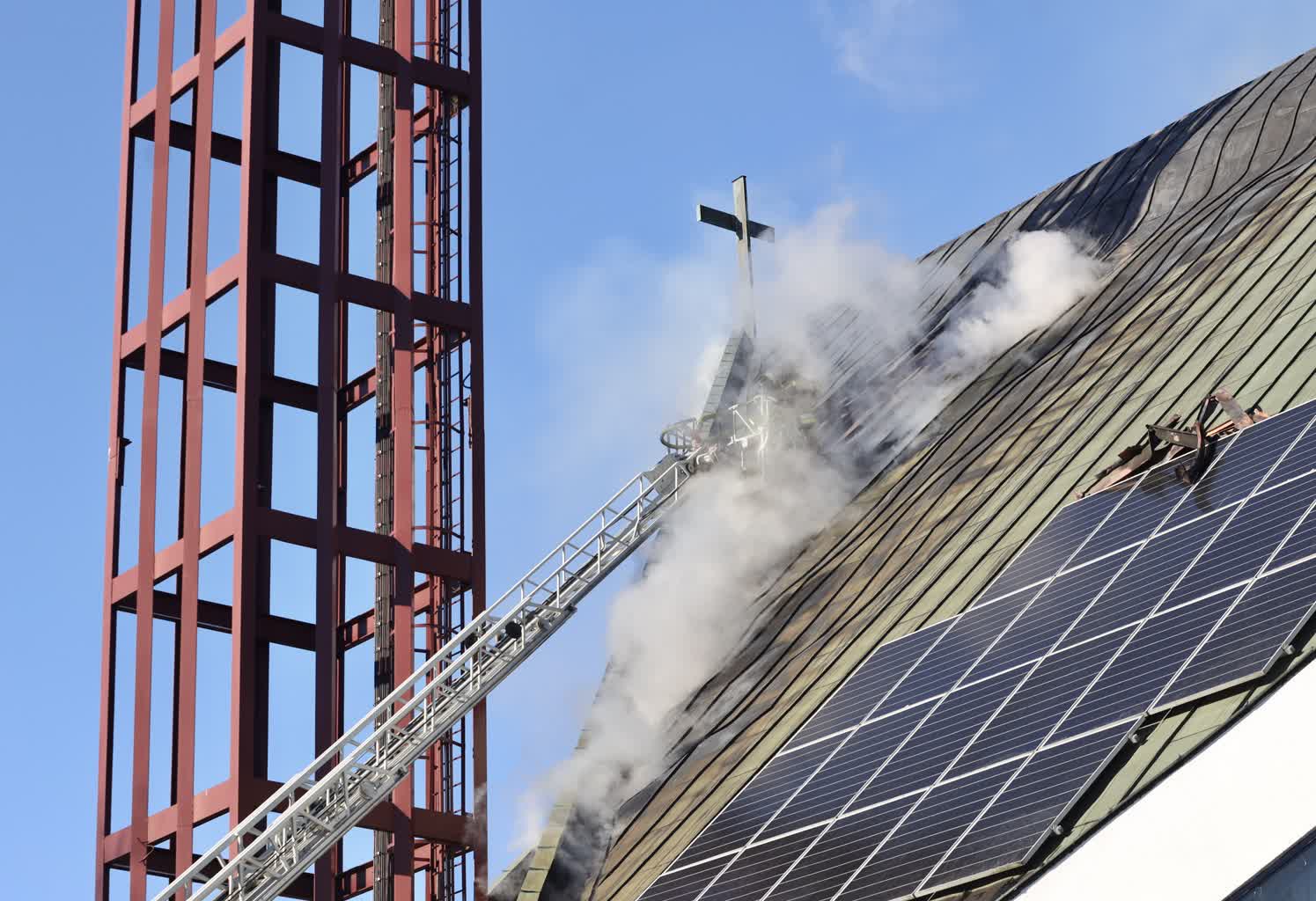 Trwa dogaszanie pożaru dachu i poddasza kościoła przy ulicy Kunickiego w Lublinie. Ogień jako pierwszy zauważył ksiądz proboszcz na 10 minut przed pierwszą poranną mszą świętą. I to on wyprowadził z kościoła grupę parafian.