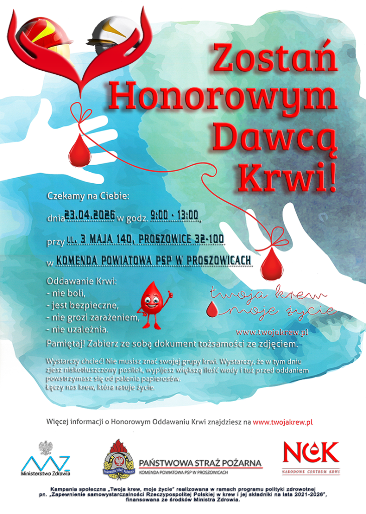 Na 23 kwietnia przy budynku KP PSP w Proszowicach zaplanowano akcję krwiodawstwa. Wydarzenie rozpocznie się o godz. 10.00 i potrwa do godz. 13.00.