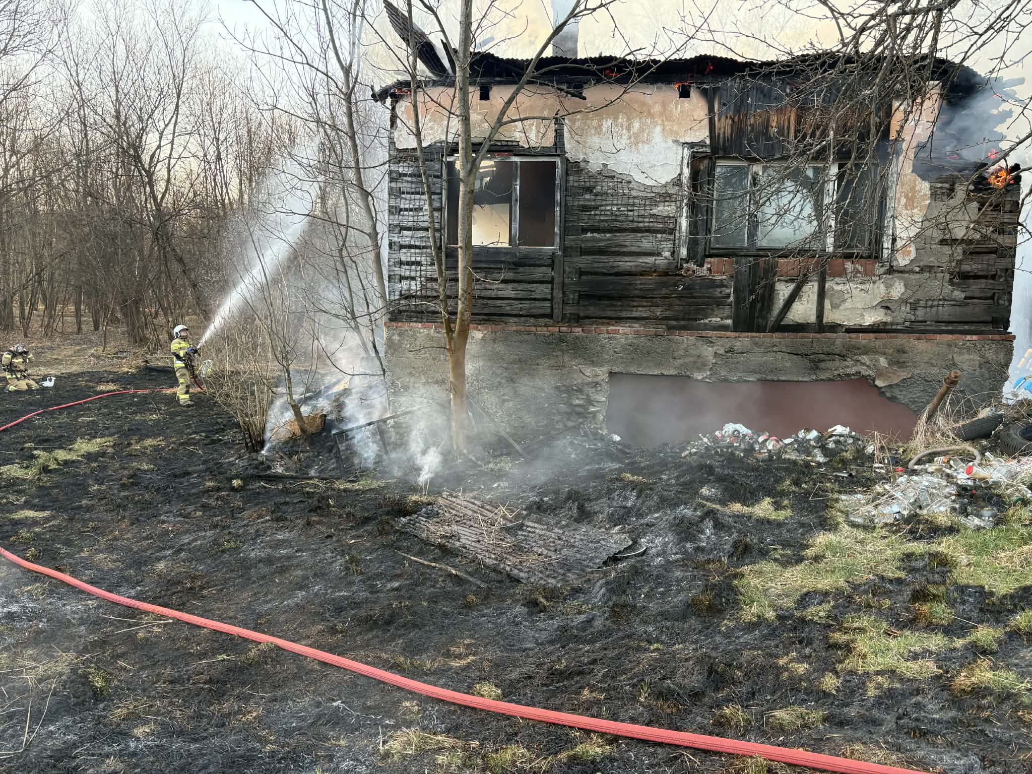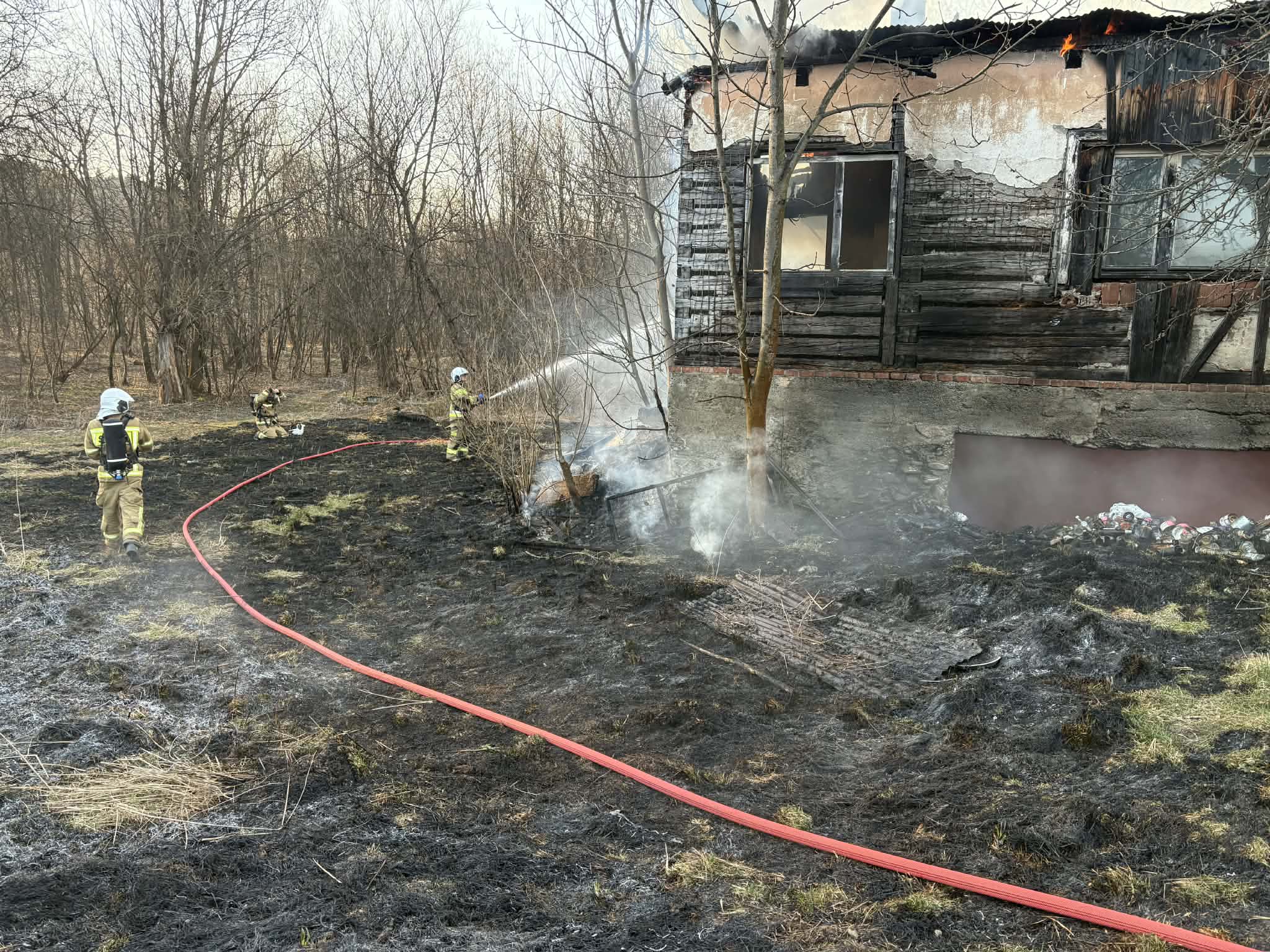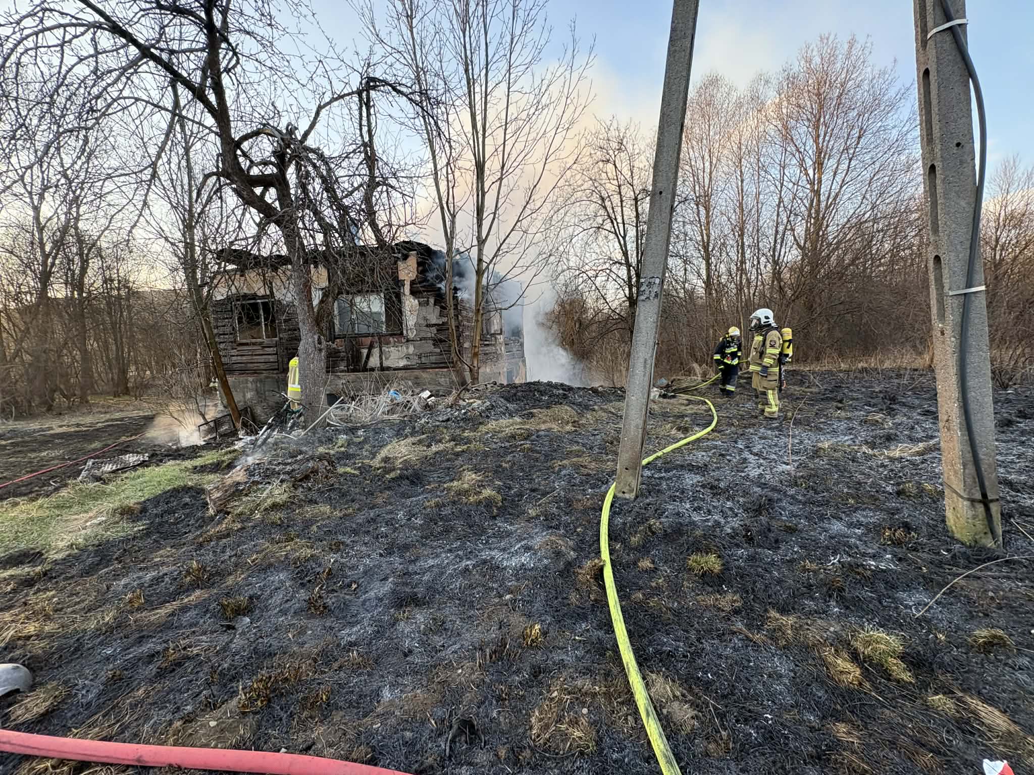 W piątek około 16:30 strażacy zostali zaalarmowani do Dobrej. Po dojeździe na miejsce pożaru strażaków, ustalono, iż pali się niezamieszkały budynek konstrukcji drewnianej – w całości objęty jest pożarem. Wokół obiektu paliła się również sucha trawa oraz zarośla.