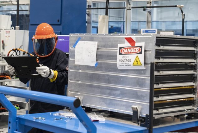 Pracownik instaluje płytkę instalacyjną w akumulatorze w zakładzie produkującym akumulatory litowo-jonowe w Mirabel w Quebecu.