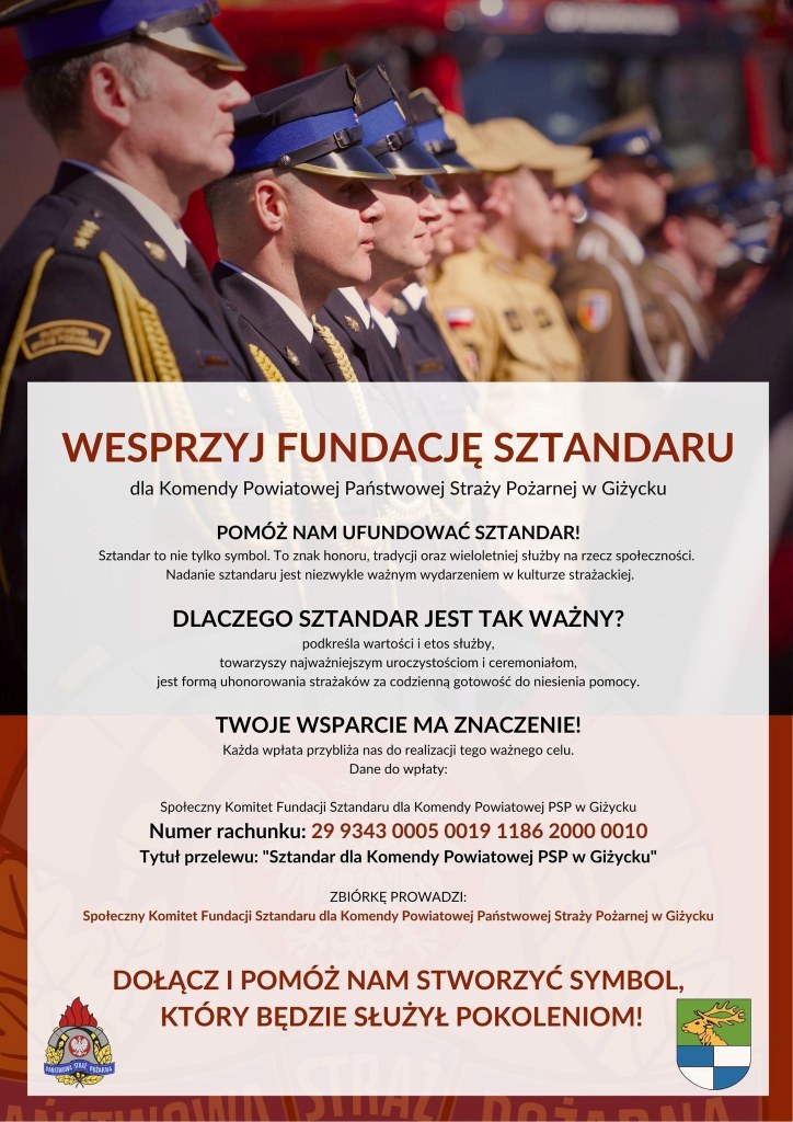 Strażacy z Komendy Powiatowej Państwowej Straży Pożarnej w Giżycku prowadzą zbiórkę na pierwszy w historii sztandar swojej jednostki. To wyjątkowy symbol honoru, tradycji i służby, który towarzyszy najważniejszym uroczystościom i pozostaje z jednostką przez kolejne pokolenia.
