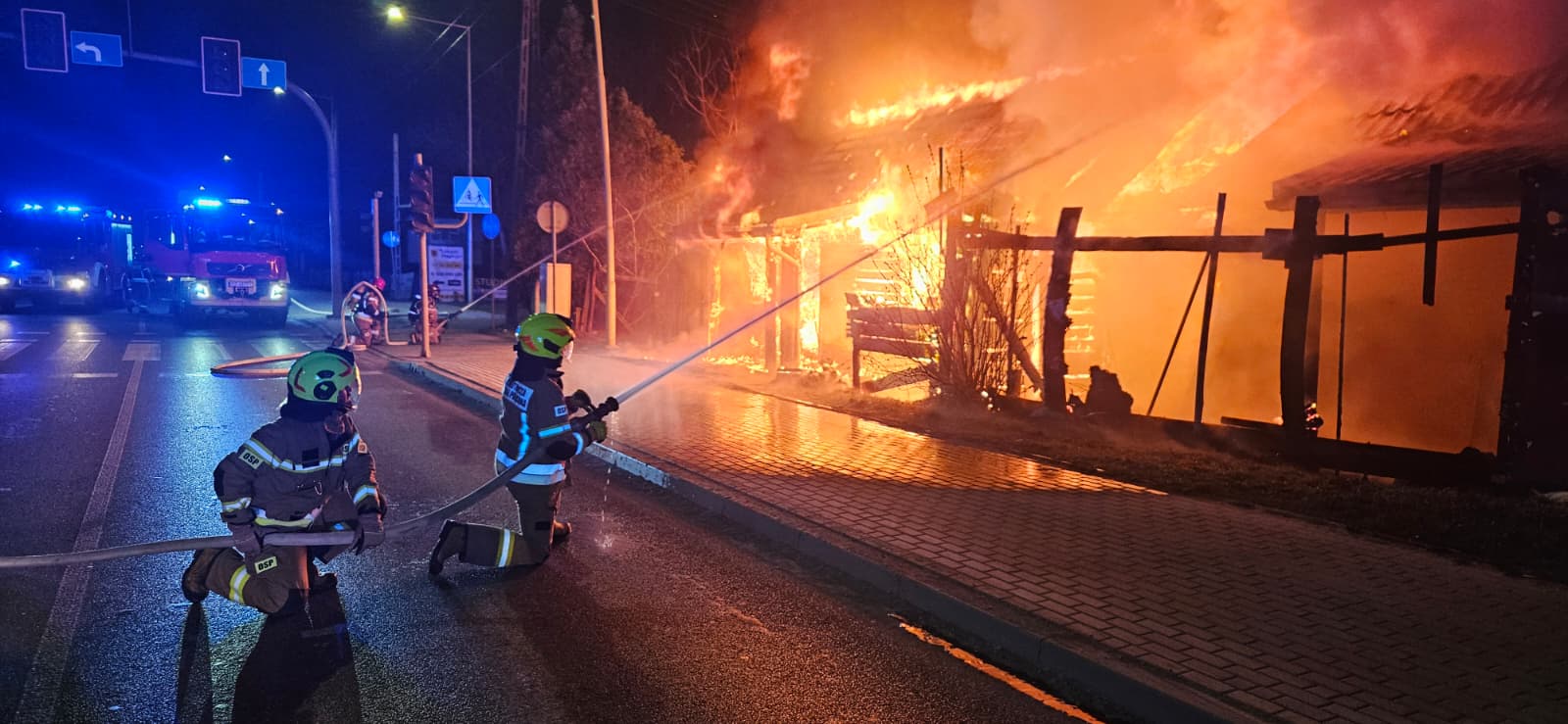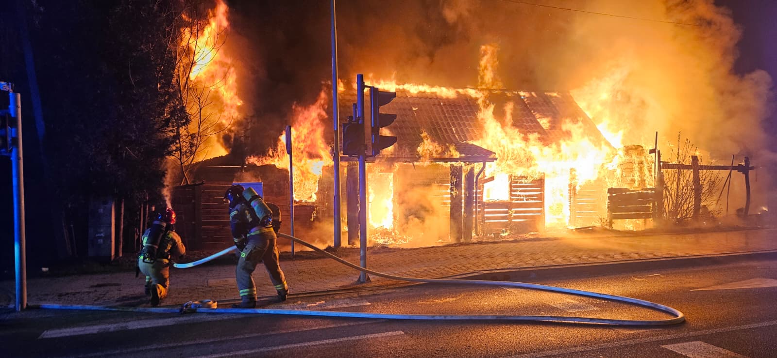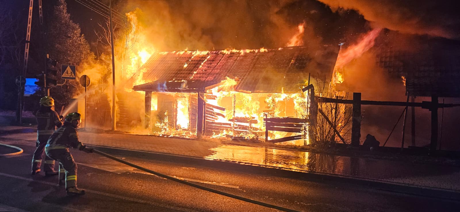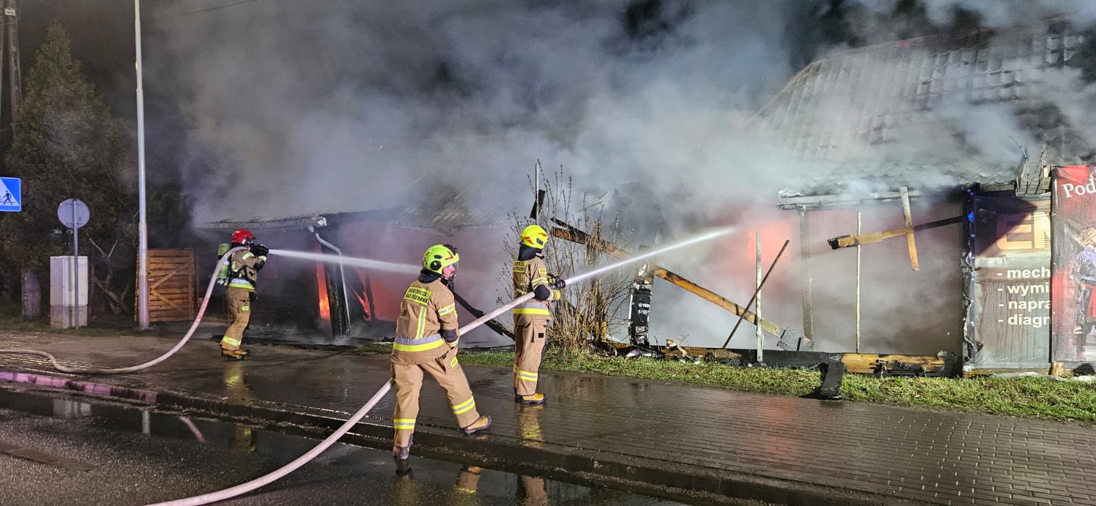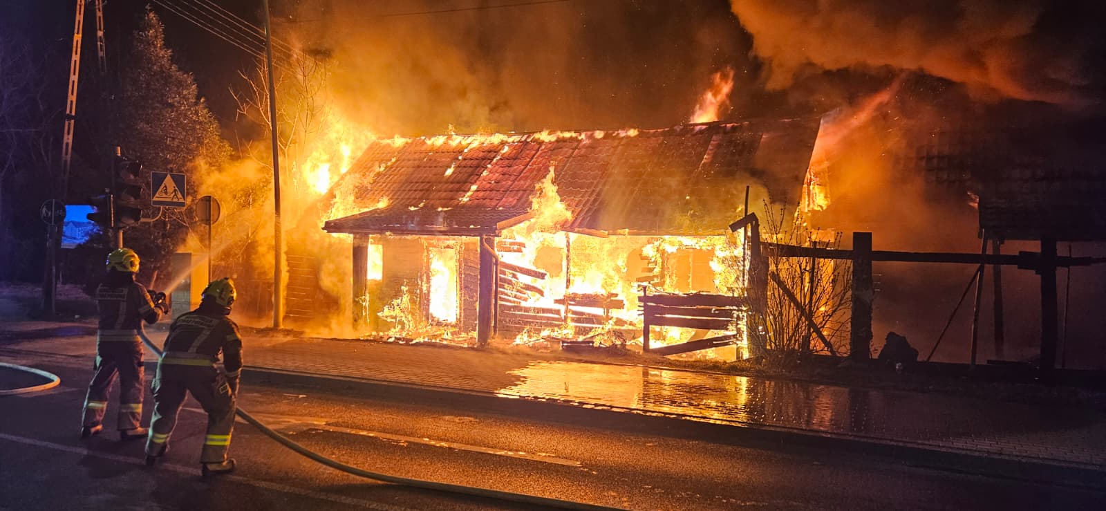 Strażacy zabezpieczyli teren, podali prądy wody na palący się budynek oraz prowadzili działania obronne na część sąsiednią. W trakcie akcji doszło do zawalenia się części konstrukcji, co utrudniało gaszenie i prowadzenie prac rozbiórkowych oraz dogaszanie pogorzeliska.