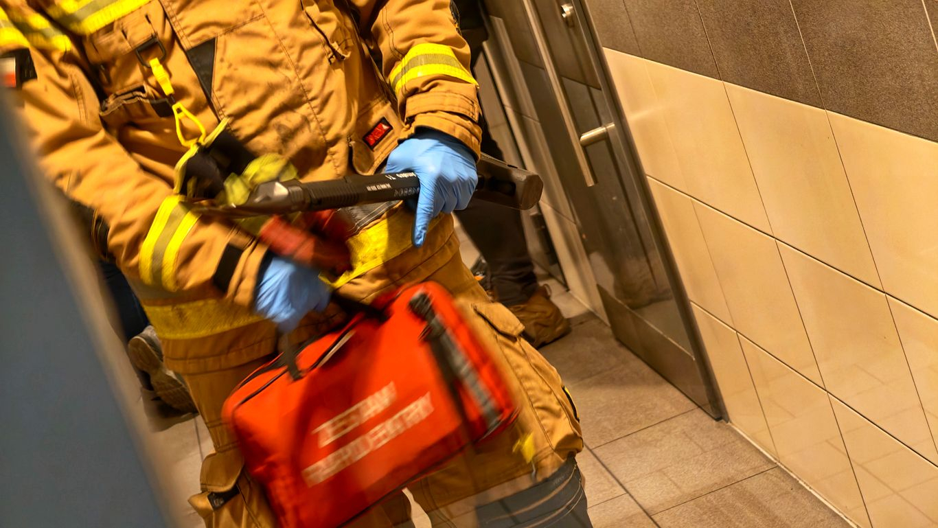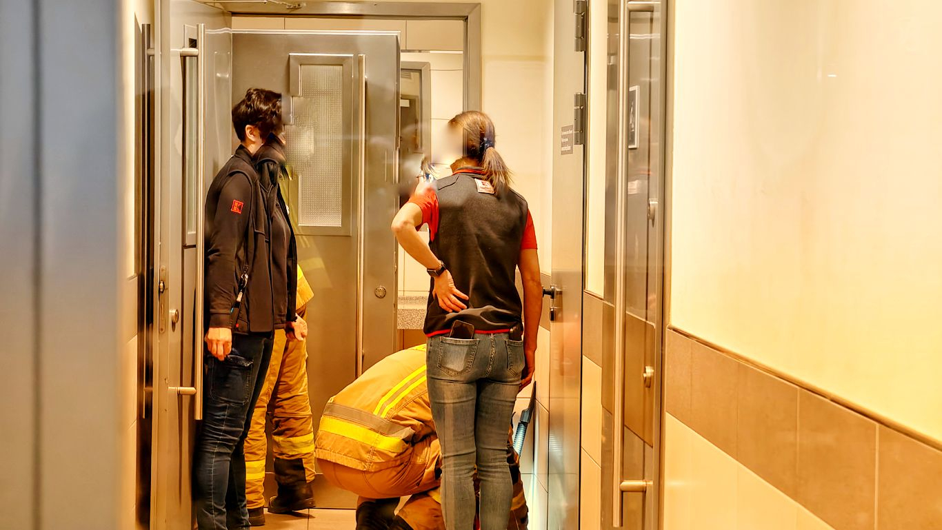 Po wejściu do toalety damskiej potwierdzono, iż drzwi do jednej z kabin są zamknięte, a znajdująca się w środku kobieta nie reaguje na wołanie. Sytuacja wyglądała poważnie, dlatego jeden ze strażaków przygotował apteczkę oraz łom – na wypadek konieczności siłowego wejścia.