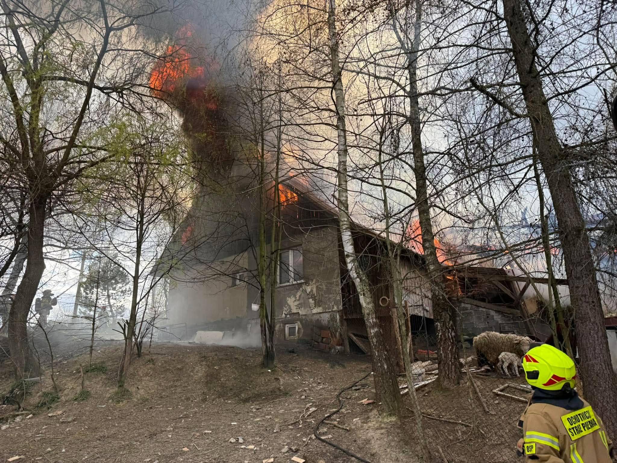 – Ogniem objęte było poddasze budynku mieszalnego oraz budynku gospodarczego. Natomiast w odległości około 10 metrów od pożaru znajdował się drugi budynek ze zwierzętami. W płonącym budynku gospodarczym również znajdowały się zwierzęta. Strażacy przystąpili do ewakuacji zwierząt oraz gaszenia pożaru z wykorzystaniem kilku linii gaśniczych. Działania prowadzono z zewnątrz, jak również wewnątrz budynków. Sytuacja wymagała używania aparatów ochrony dróg oddechowych przez strażaków. Po opanowaniu sytuacji i stłumieniu pożaru wykonano rozbiórkę nadpalonej konstrukcji dachu, która groziła zawaleniem. Wodę do pożaru dowożono z hydrantu z odległości około 5 km – informuje st. kpt. Wojciech Bogacz, rzecznik prasowy PSP w Limanowej.