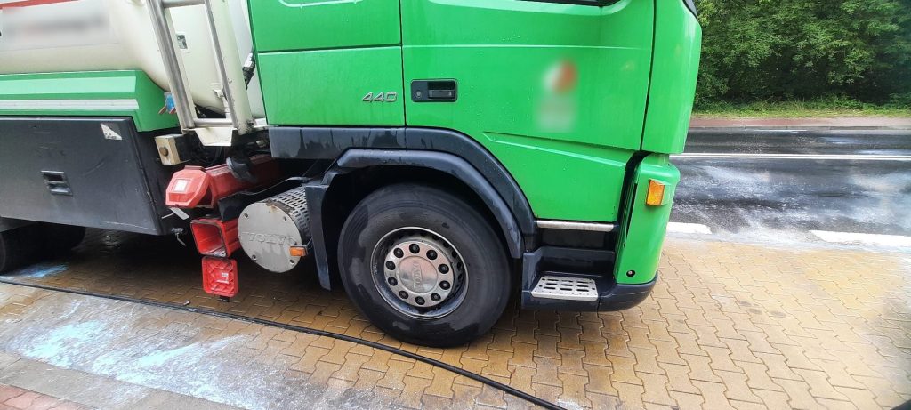 – „Kierowca stojąc na przejeździe kolejowym zauważył dym wychodzący spod prawego przedniego koła pojazdu, zjechał na pobliską zatokę przystanku autobusowego i przystąpił do samodzielnego gaszenia pożaru dzięki gaśnicy proszkowej oraz butelki z wodą. Na miejsce przybyły dwa zastępy z JRG Końskie, kontrolowały temperaturę opony i układu hamulcowego oraz dokończyły dogaszanie. Naczepa ciężarówki – cysterna służyła do przewozu oleju napędowego, ale w trakcie zdarzenia była pusta” – informuje kpt. Jacek Suder z PSP Końskie.